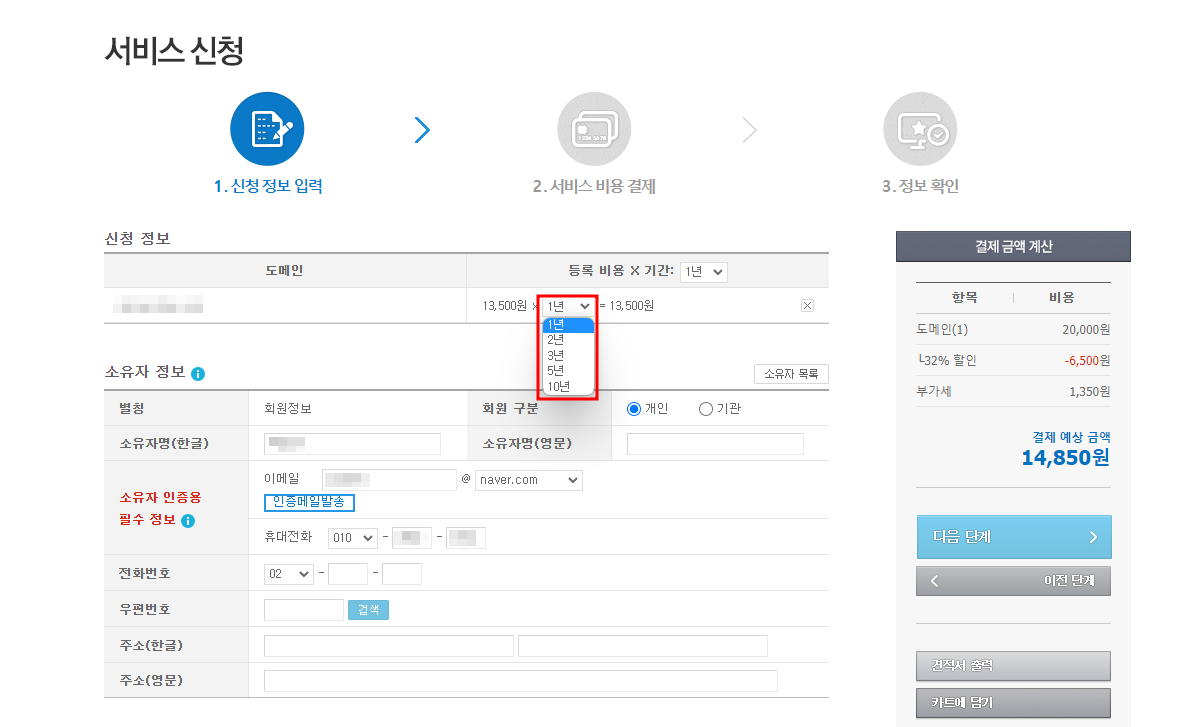 저는 1년만 사용 할 거라 1년 선택하겠습니다.