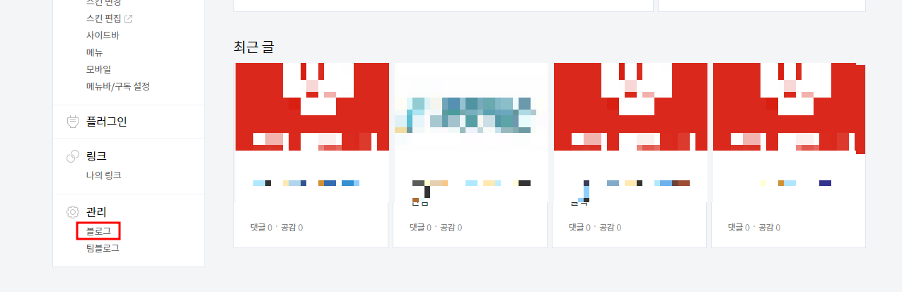 좌측 카테고리 부분의 관리 < 블로그를 클릭합니다.