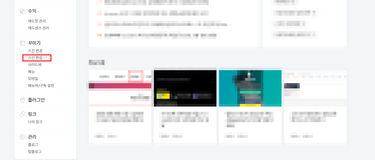 티스토리 로그인 후 꾸미기 < 스킨편집을 눌러줍니다.