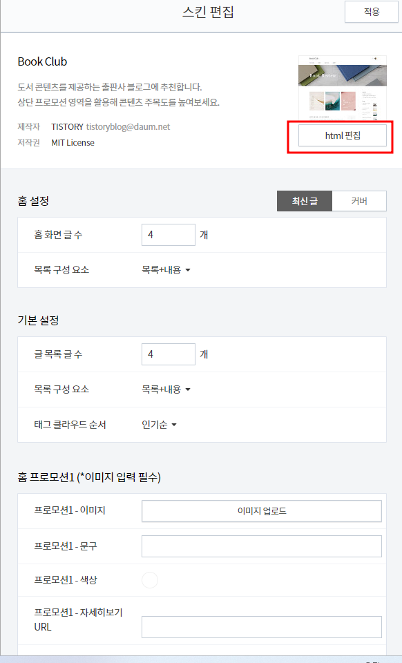 스킨편집을 누르면 우측에 html 편집이 있습니다.