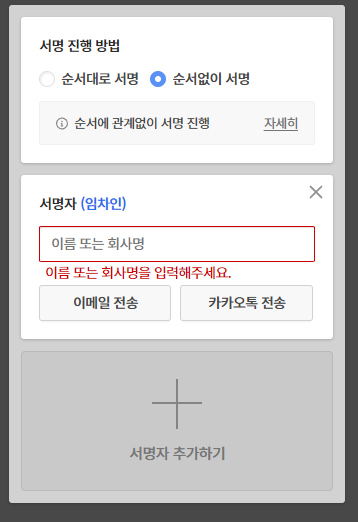 서명자 이름이나 회사명을 입력 후 이메일로 전송할지 카카오톡으로 전송할지 선택해줍니다.