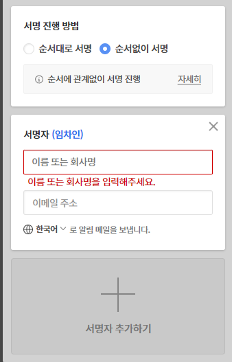 그다음 서명 진행 방법을 순서대로 할건지 순서없이 할건지 정해주면 됩니다.