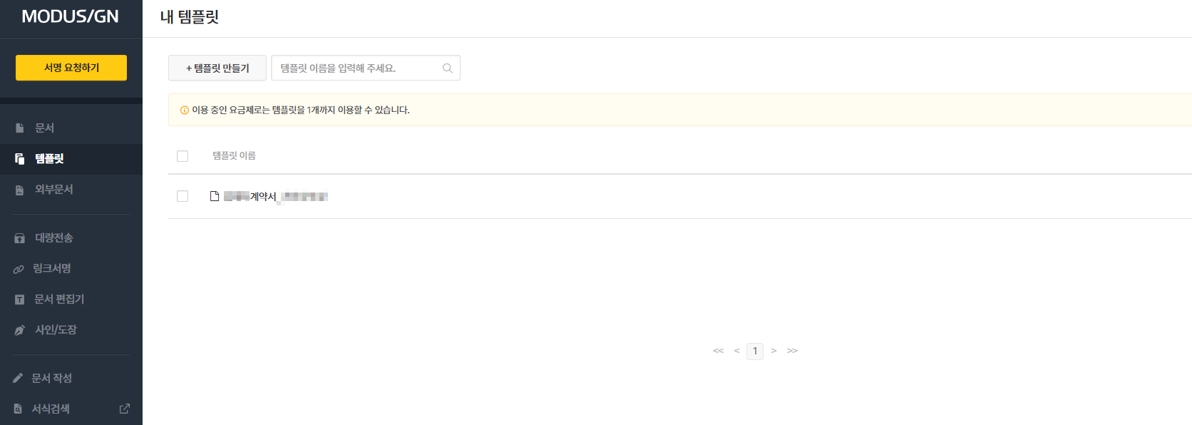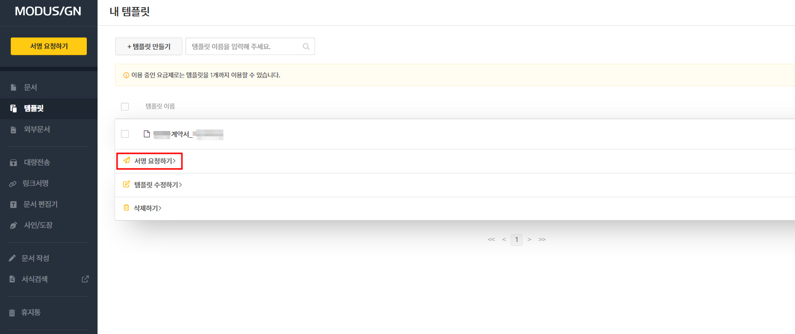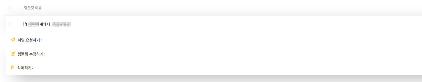 템플릿 만들기를 완료 했다면 계약서를 클릭하면 위와 같이 서명요청하기 / 템플릿 수정하기 / 삭제하기가 나올거에요.