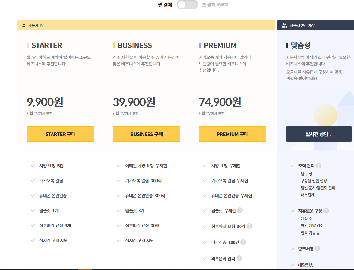 스타터 / 비즈니스 / 프리미엄 세가지 요금제가 있습니다.
