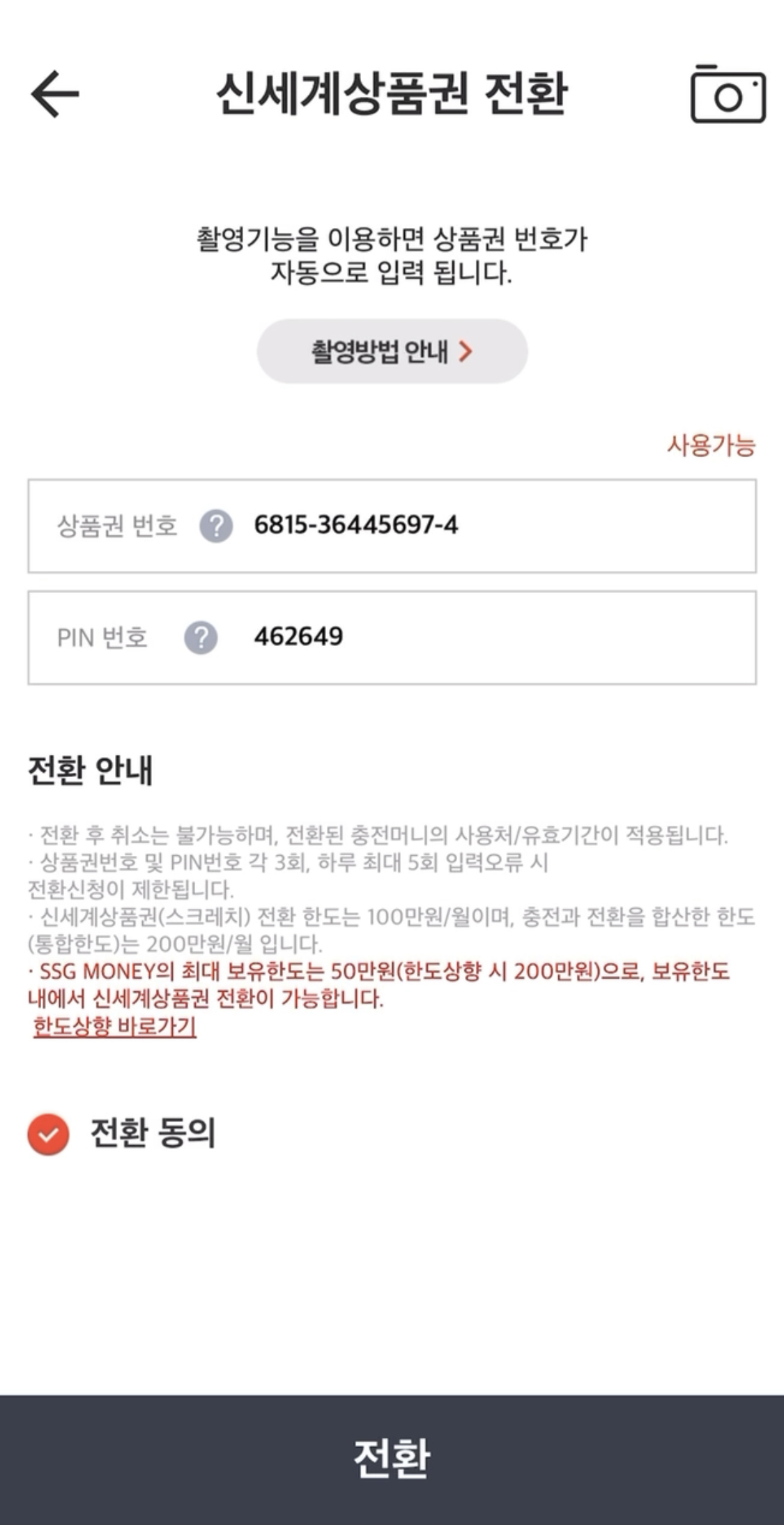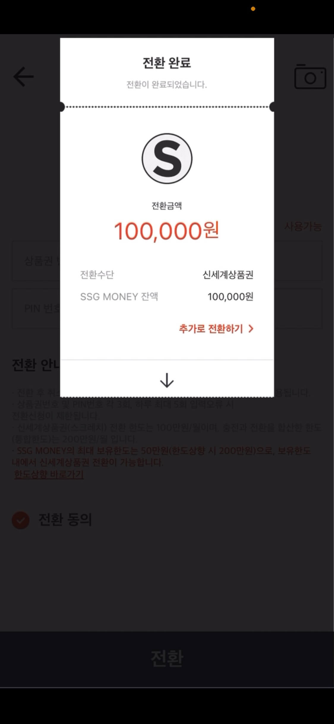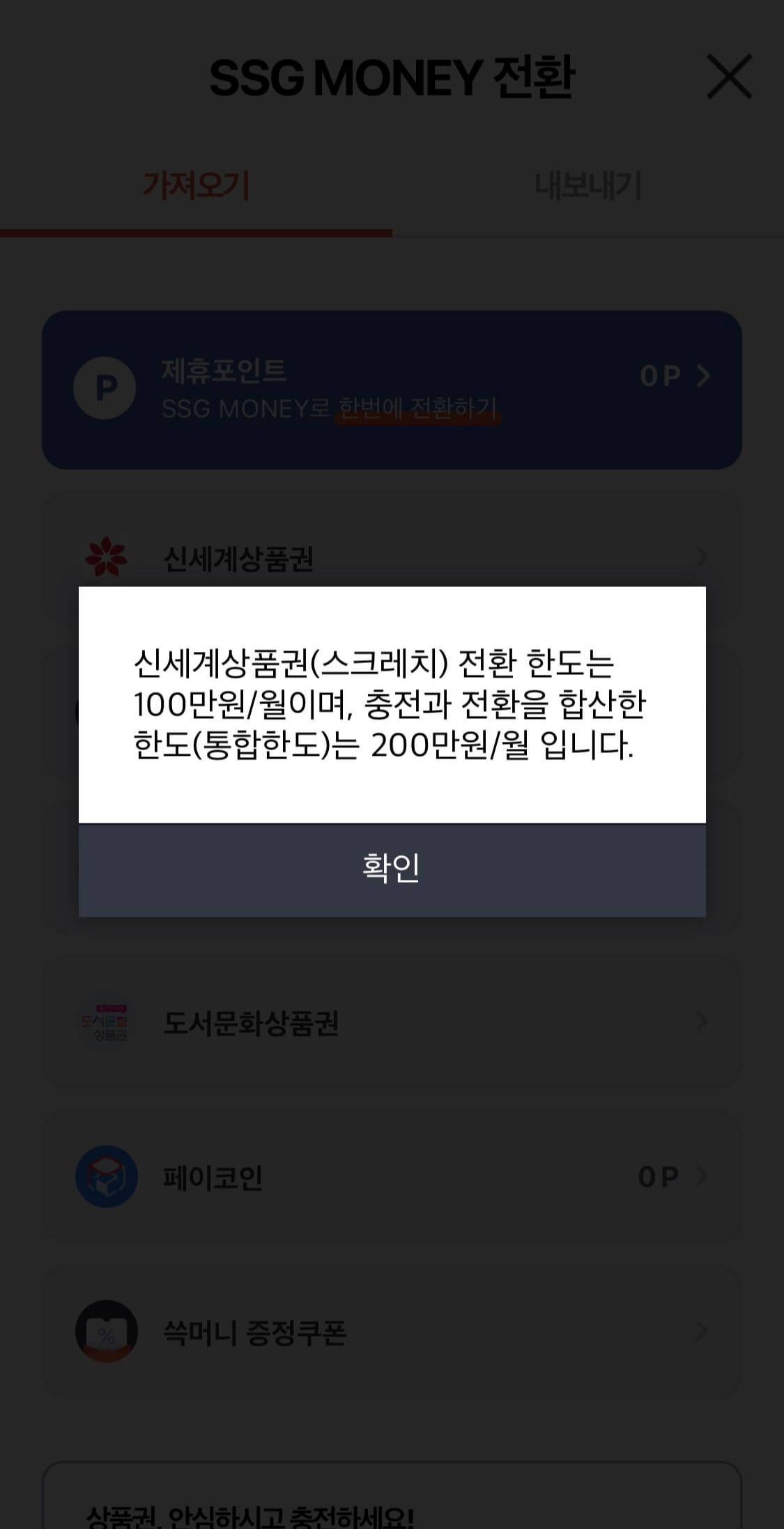 신세계상품권(스크레치 있는) 전환 한도는 1월 100만원 이고, 충전/전환 합산 한도는 200만원 입니다.
