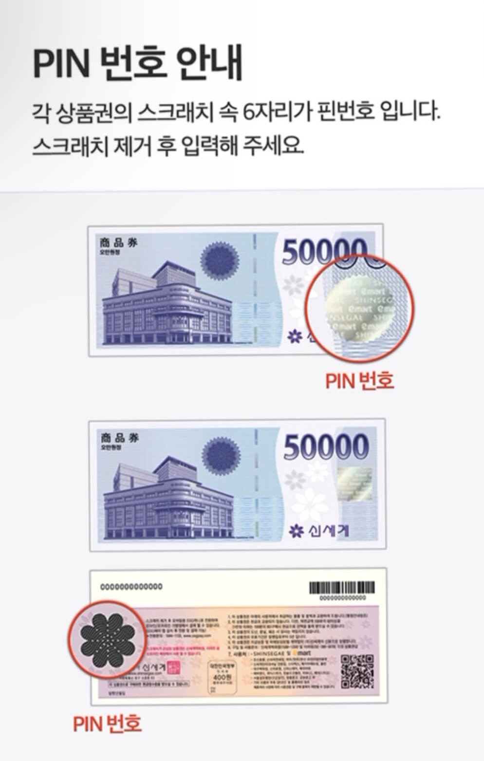 참고로 PIN 번호는 상품권 앞면의 스크레치를 긁어서 확인 가능합니다.