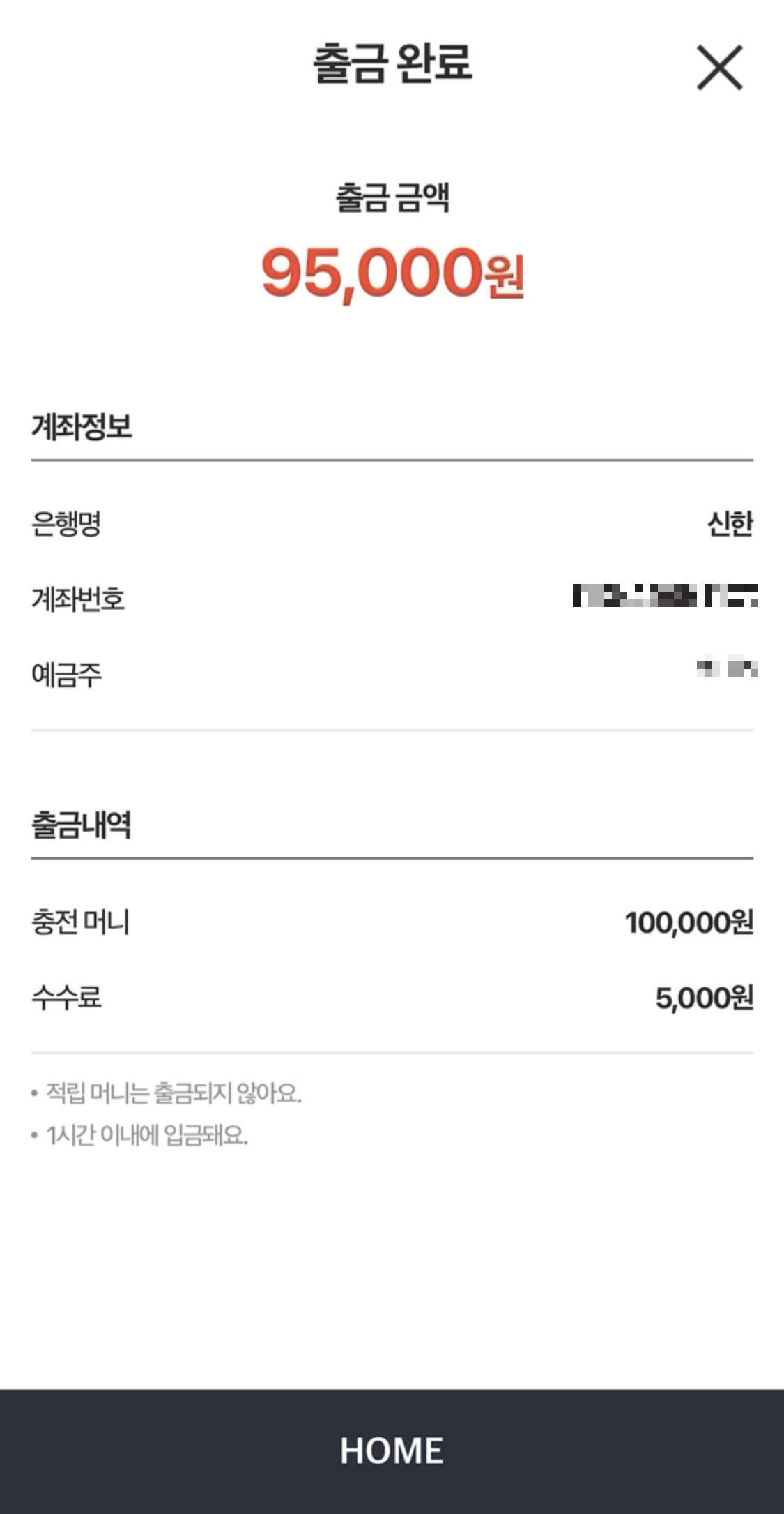 수수료 5천원을 제외한 9만5천원이 입력한 계좌로 입금 되신 걸 확인 하실 수 있습니다.