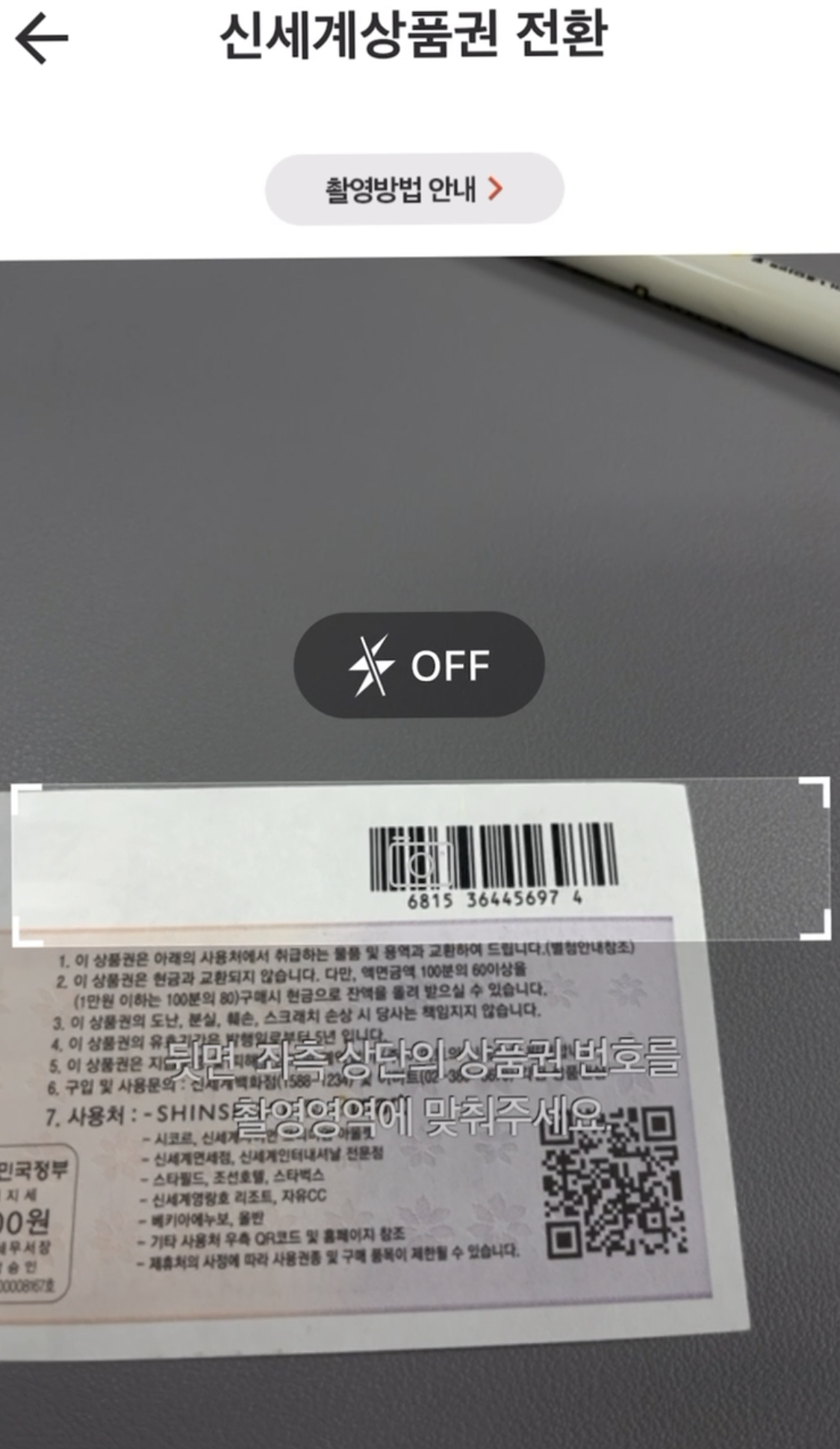 5. 카메라가 활성화 되면 신세계상품권 뒷면의 바코드를 스캔 합니다.