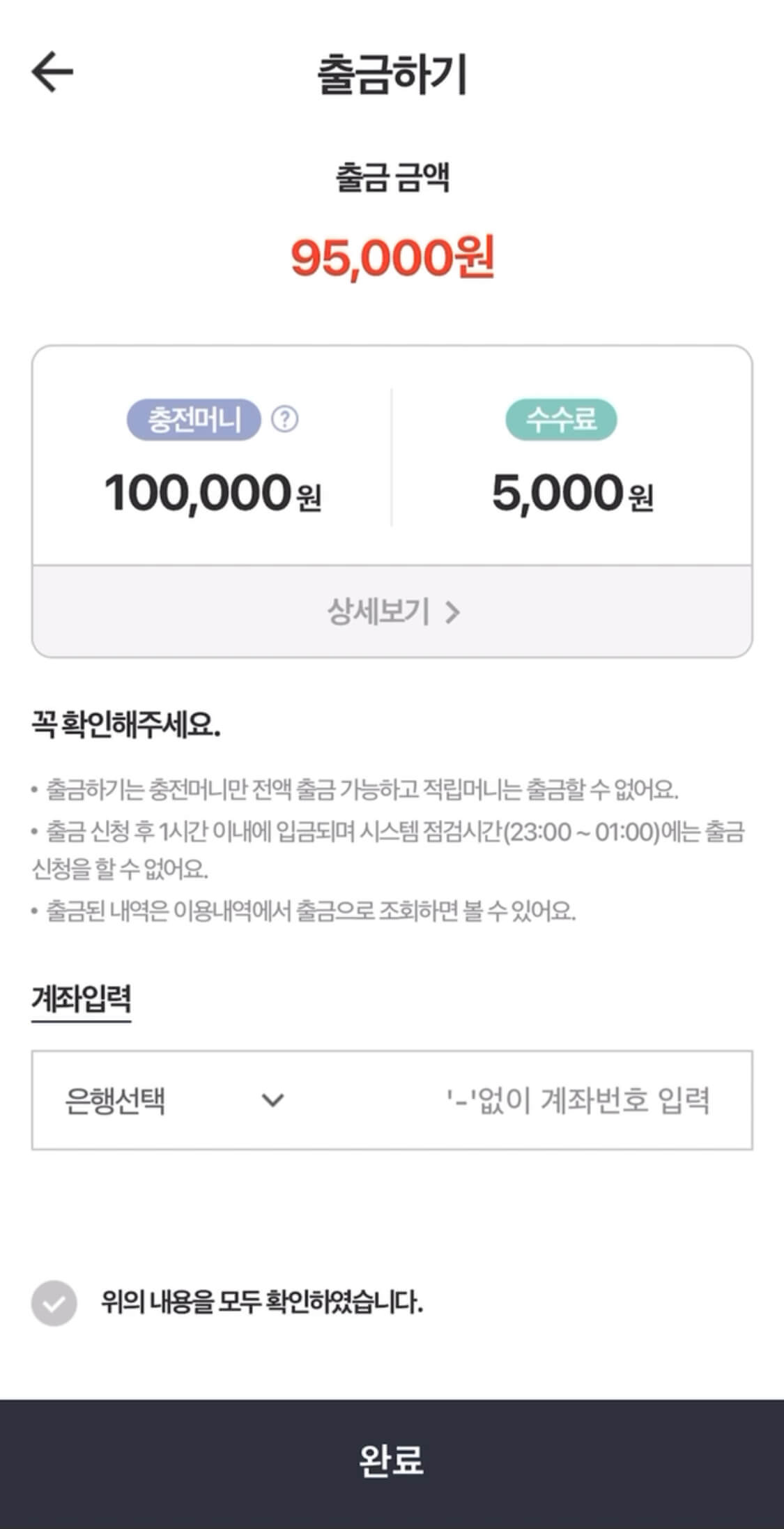 충전머니에서 현금으로 출금할때는 100% 출금 되는것이 아닌, 수수료 5%를 제외한