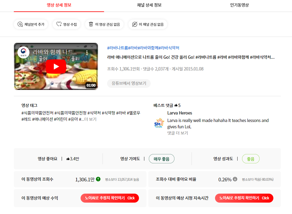 동영상을 클릭 해 들어가면 영상 조회수 성장 추정값을 확인 할 수 있습니다.