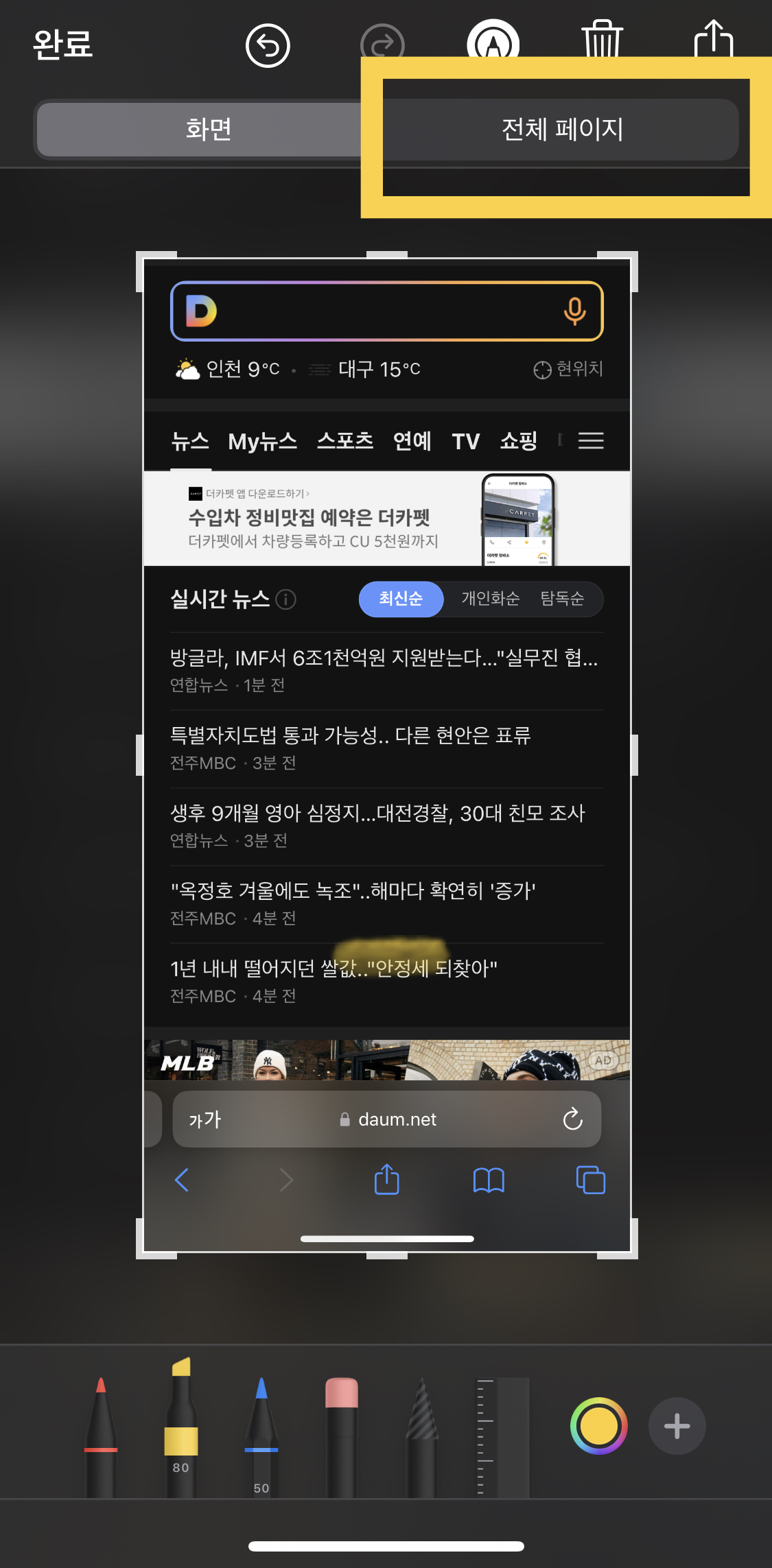 전체페이지 선택 후 좌측 상단 완료 버튼 터치!