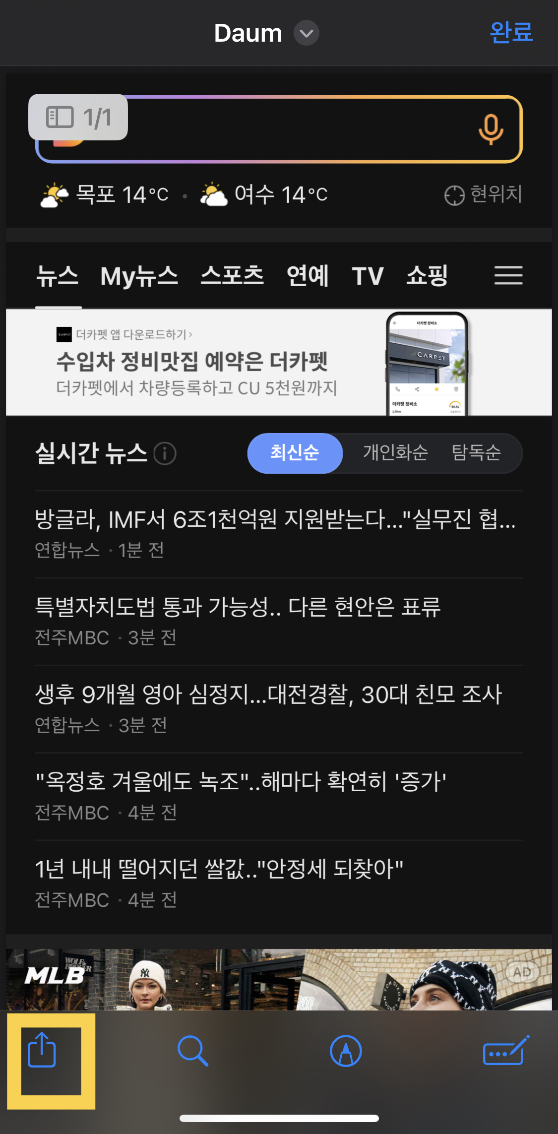 해당 사진을 누른 후 좌측 하단의 공유 아이콘을 눌러줍니다.