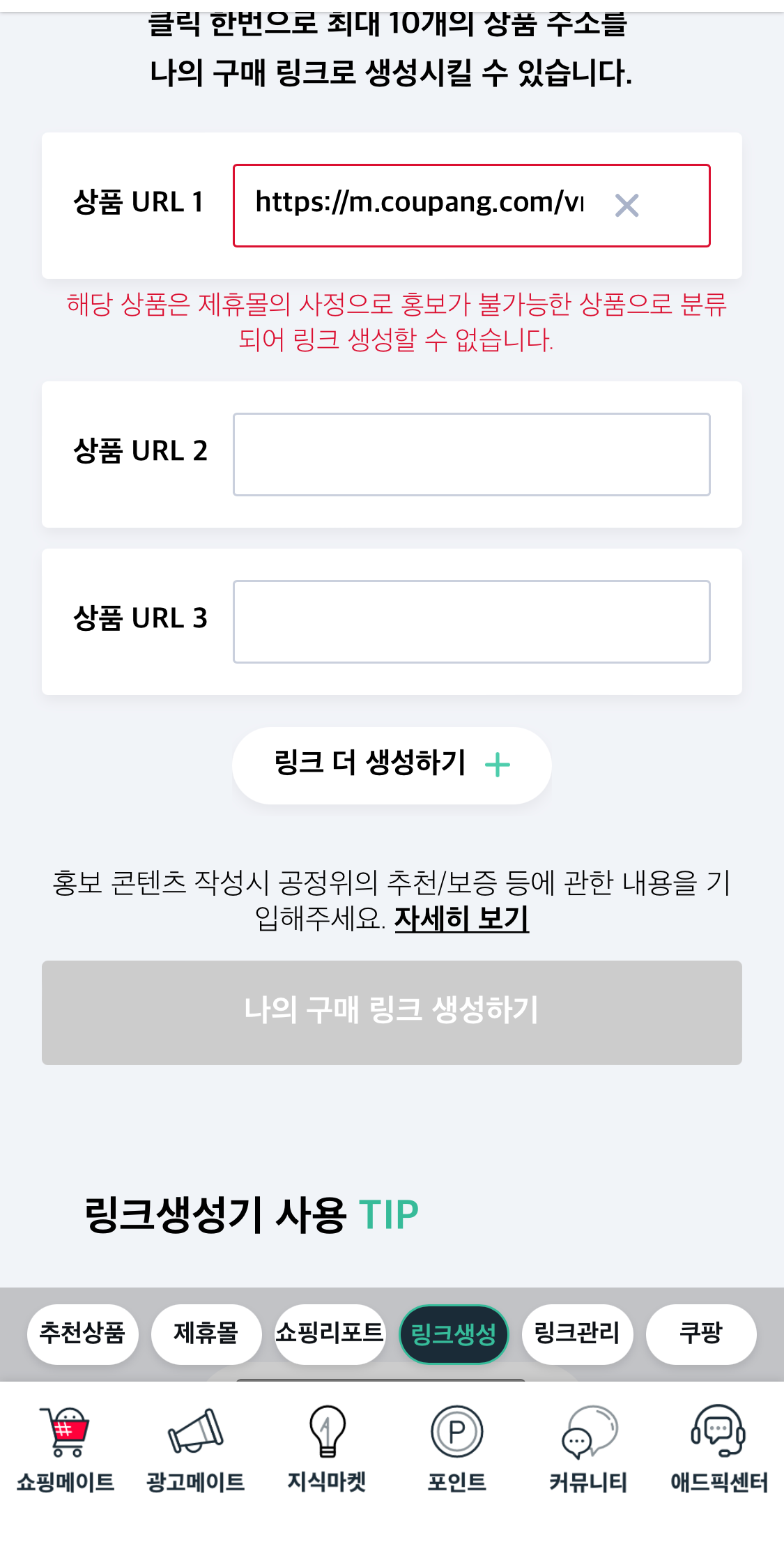 내가 원하는 제휴몰의 상품 URL을 복사해 상품URL1에 붙여넣기 후 나의 구매 링크 생성하기를 눌러줍니다.