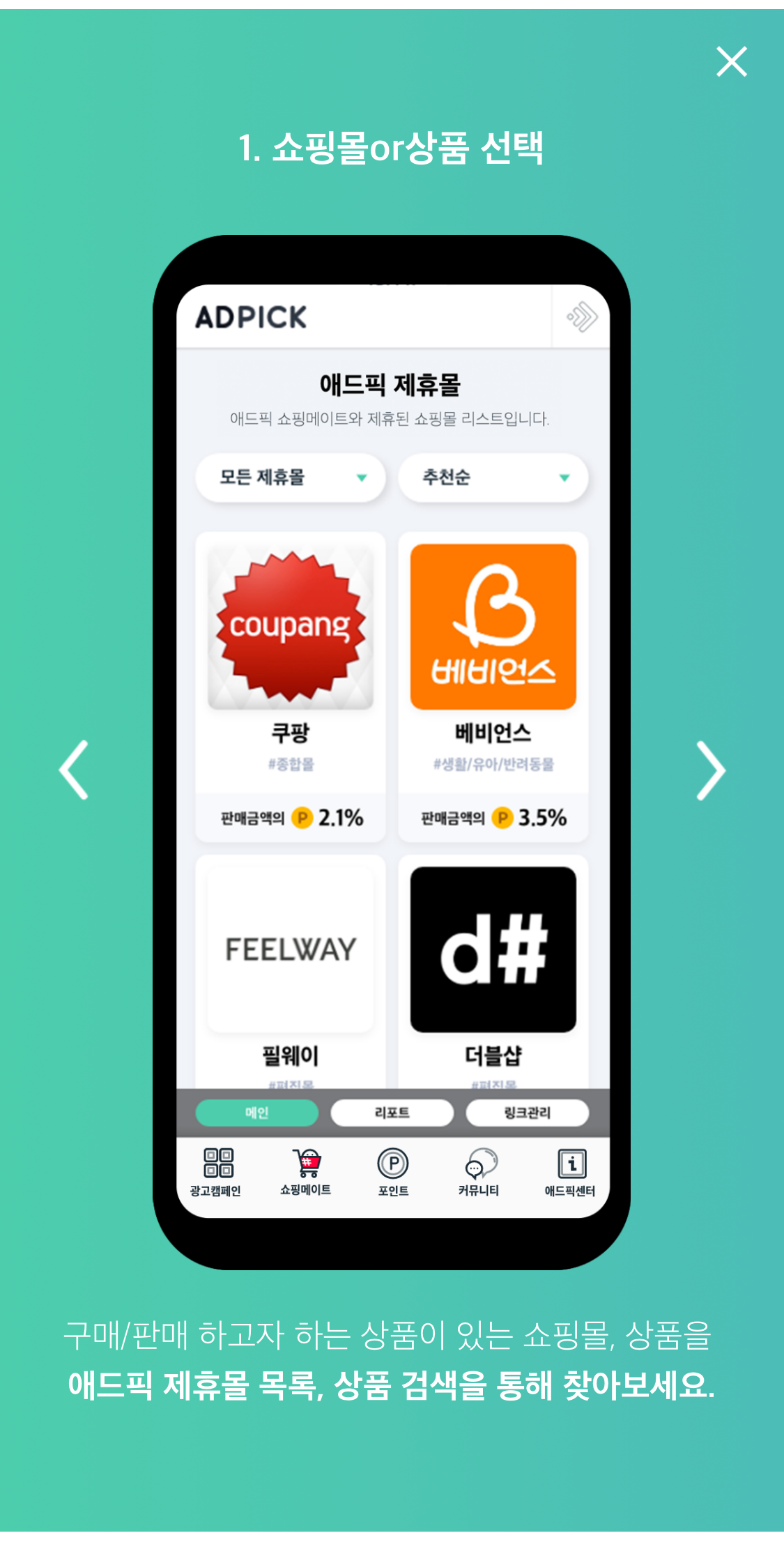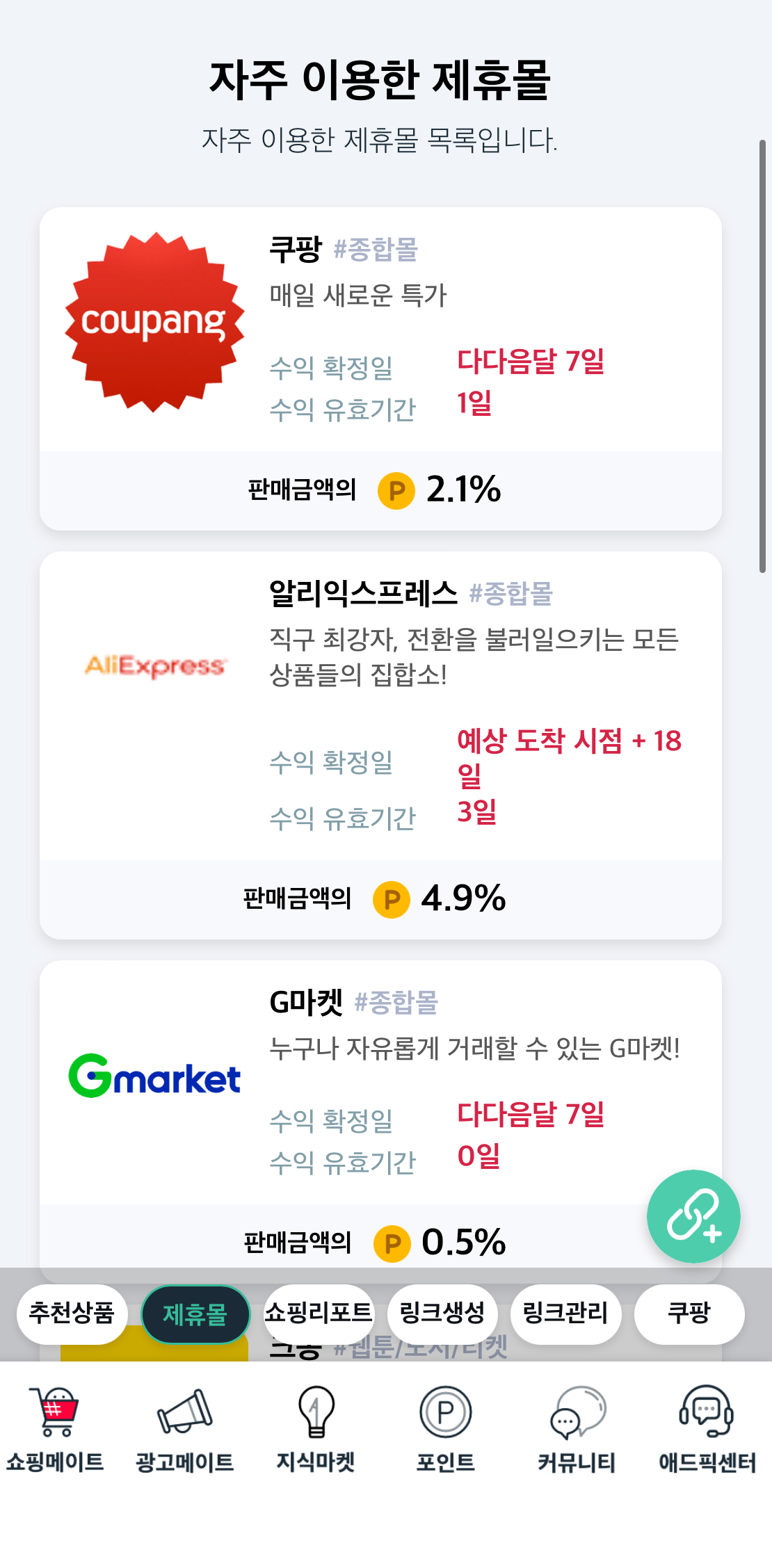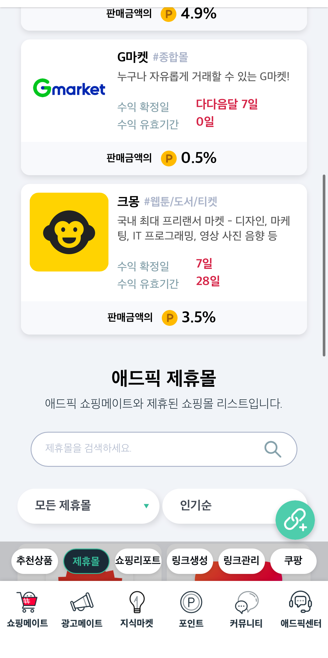 맨 하단 좌측부터 보면 쇼핑메이트 < 광고메이트 < 지식마켓 < 포인트 < 커뮤니티 < 애드픽 센터가 있어요.