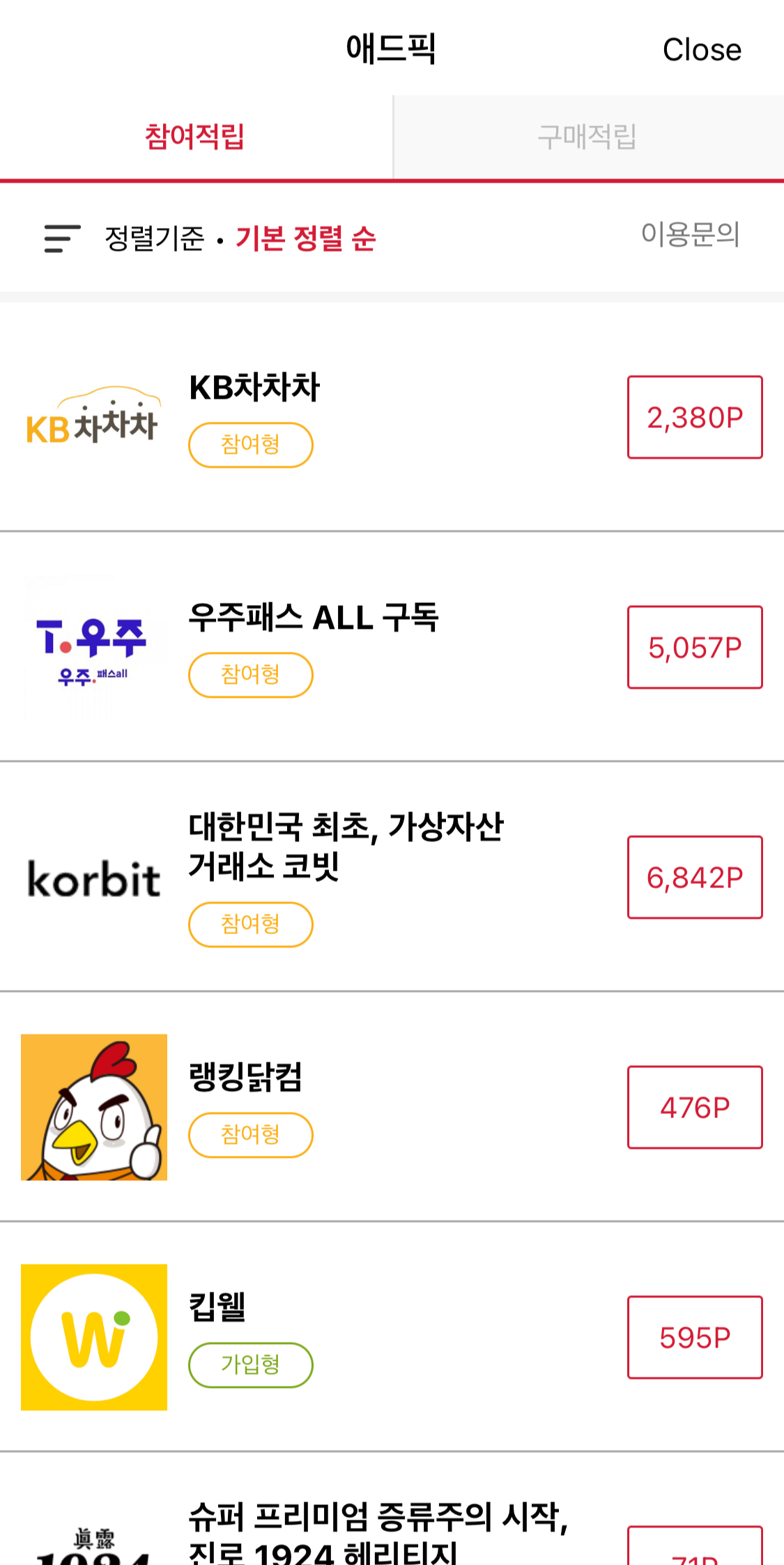 가입형은 가입만 / 참여형은 가입 후 참여 / 구매형은 제품을 구매하면 포인트가 쌓이는 방식입니다.