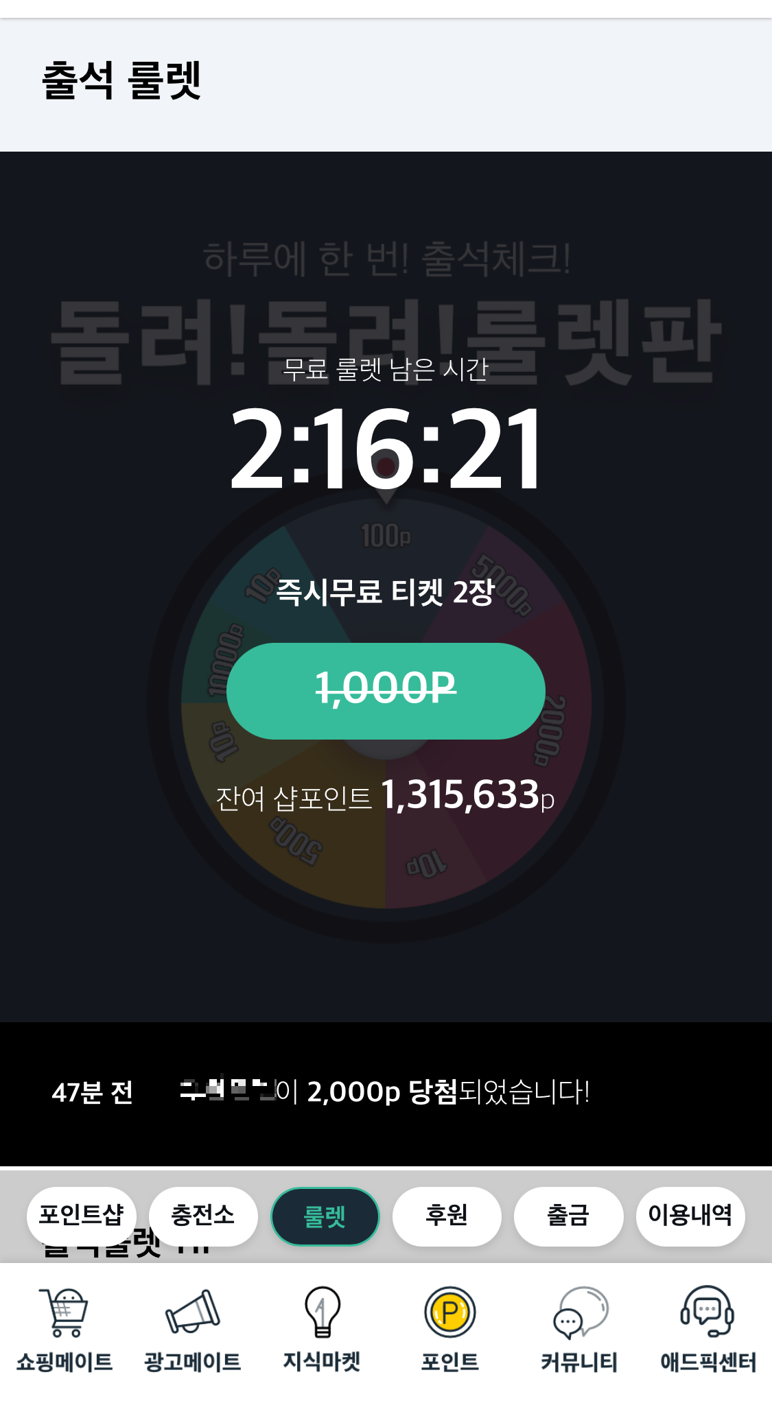 하루에 한번 출석체크 개념으로 룰렛 돌리기를 참여할 수 있어요.