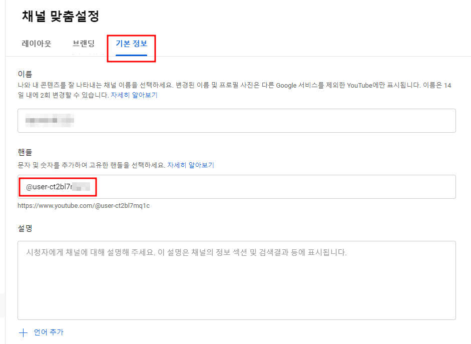 아무래도 채널에 이름에 부합한 핸들을 작성하는게 좋을 거 같아 설정했습니다.