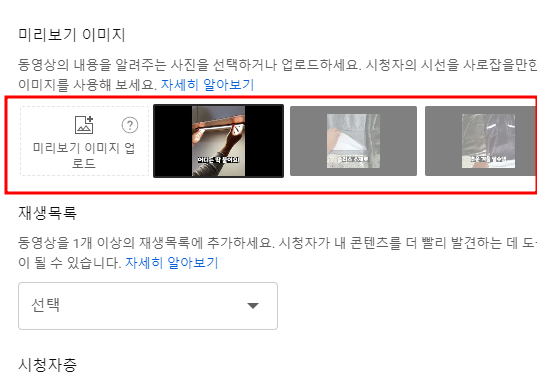 미리 만들어 놓은 썸네일을 업로드 하시거나, 자동으로 동영상의 몇가지 부분이 노출되는데 선택하셔도 됩니다.