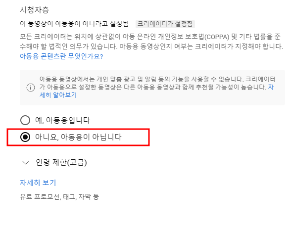 동영상이 아동용인지, 아동용이 아닌지 선택하시면 됩니다.