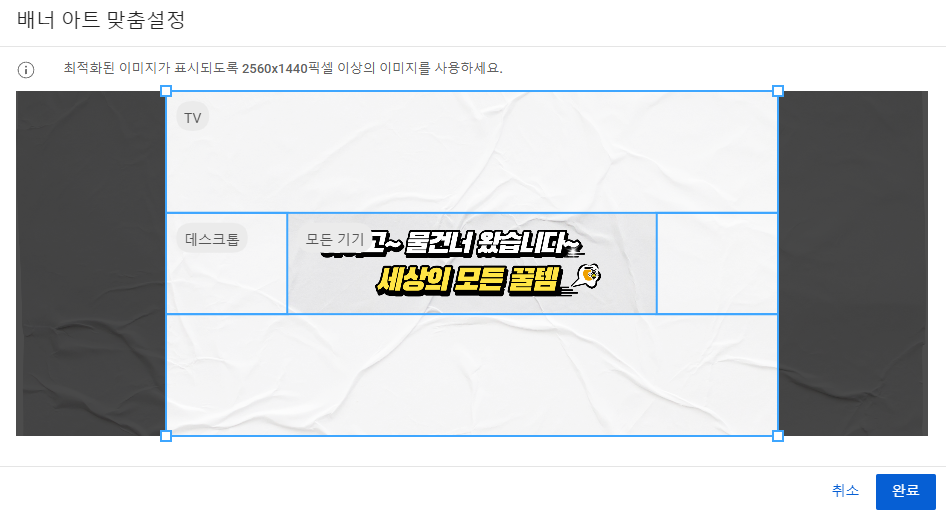 배너 이미지는 2560x1440 픽셀 이상, 6MB 이하의 이미지를 사용해야 합니다.