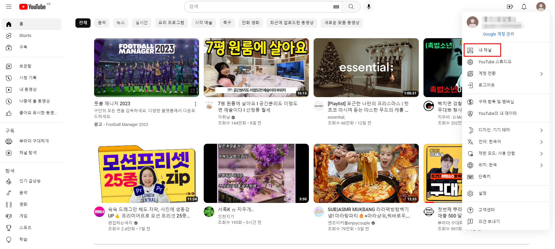유튜브 홈에서 우측 상단 프로필 사진 클릭 후 내 채널을 눌러주세요.