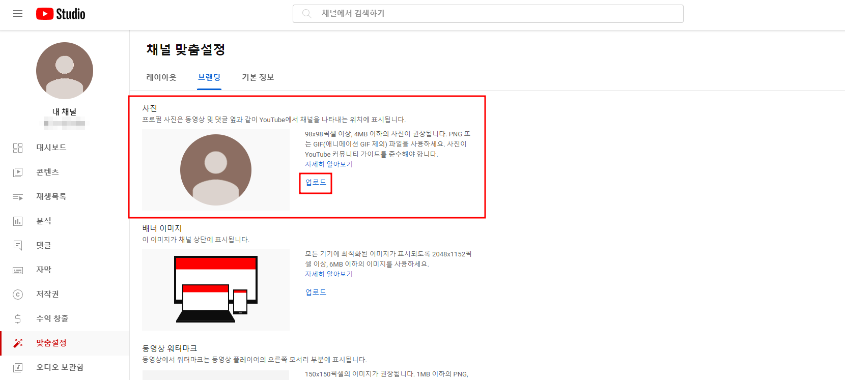 브랜딩 부분을 클릭 해 프로필 사진과 배너 이미지 변경이 가능합니다.