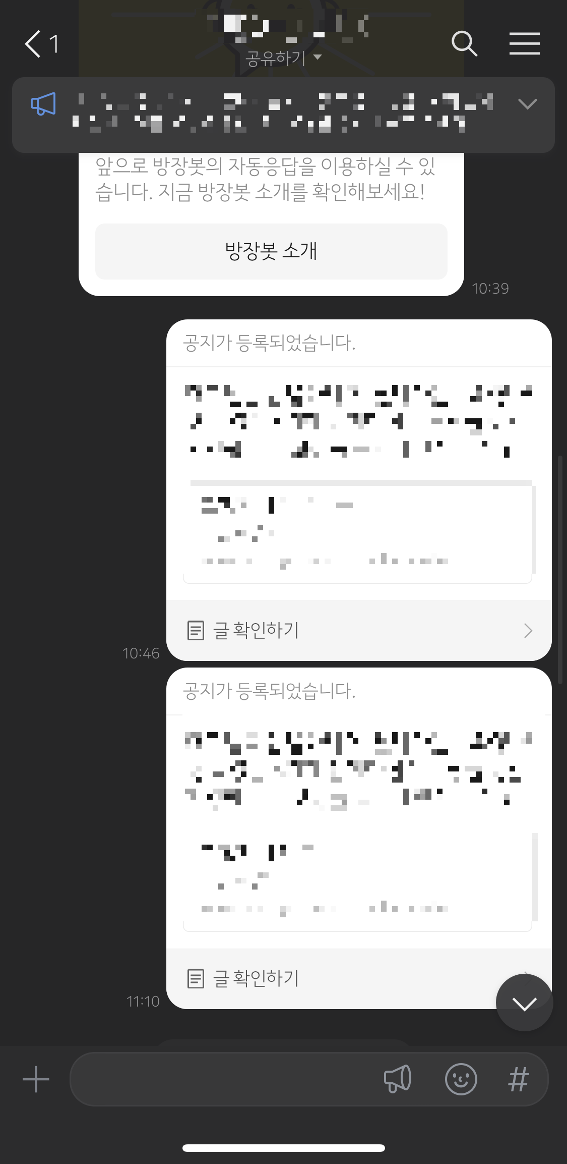 공지사항은 단체방 상단에 띄워놓고 언제든 확인 할 수 있게 하는 기능입니다.