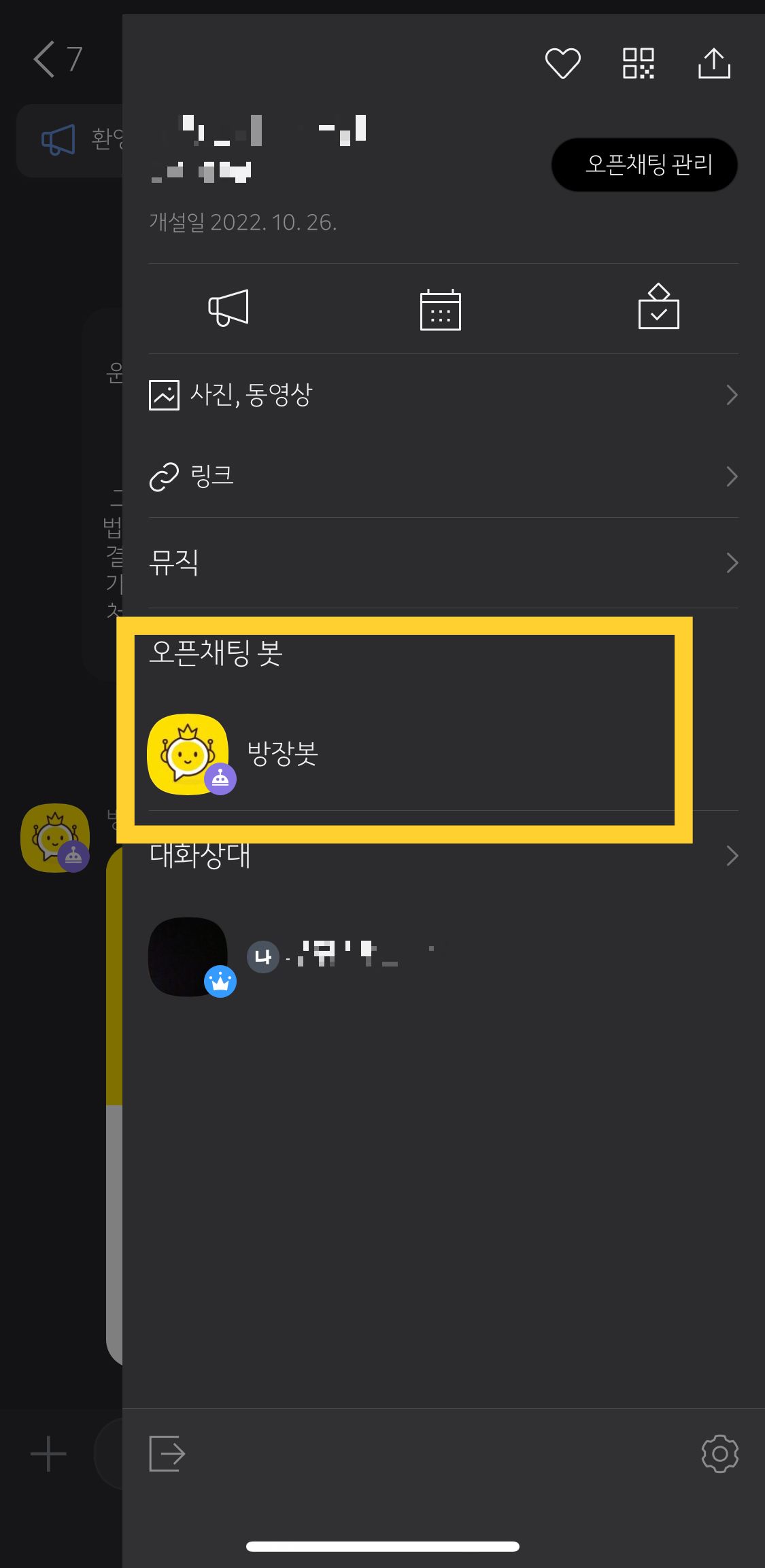 오픈 채팅 방장봇 터치 후 < 설정 터치
