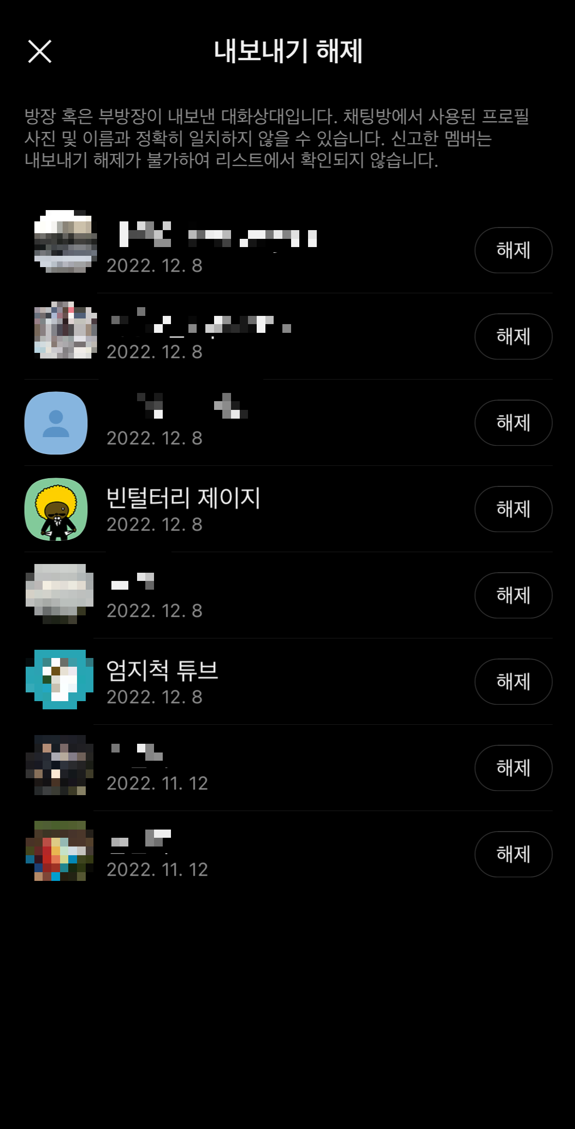 내보내기 해제를 원하는 사람 옆에 해제 버튼을 눌러주겠습니다.