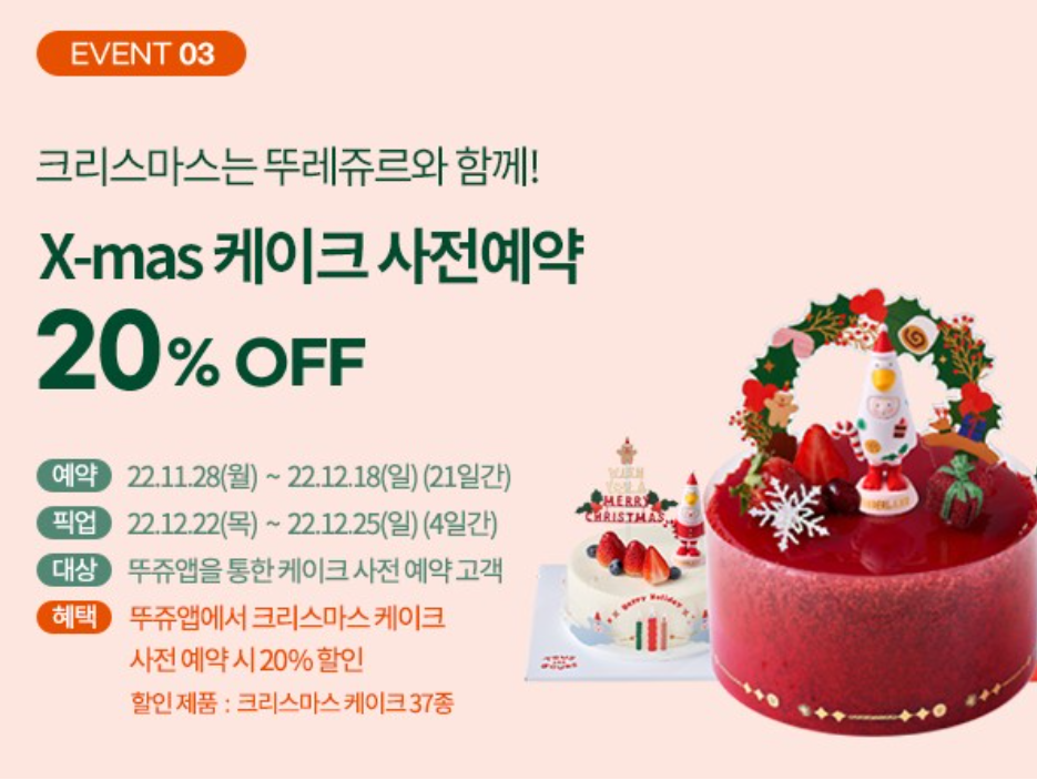 • 혜택 : 뚜쥬앱에서 크리스마크 케이크 사전 예약시 20%할인