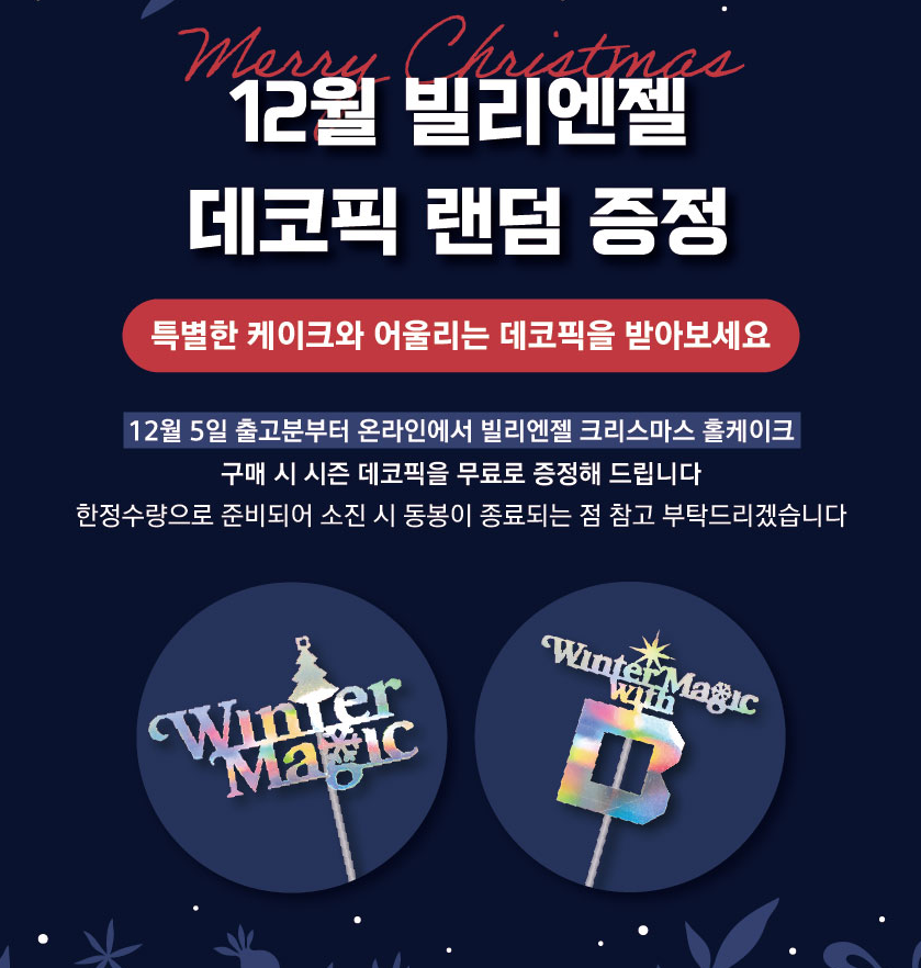 12월 5일 출고부터 온라인에서 빌리엔젤 크리스마스 홀케이크 구매시 시즌 데코픽을 무료로 증정한다고 합니다.