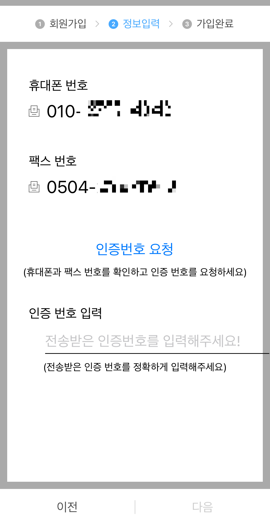 선택이 완료 되면, 휴대폰 번호 인증번호를 입력 하기만 하면 회원가입이 완료 됩니다.
