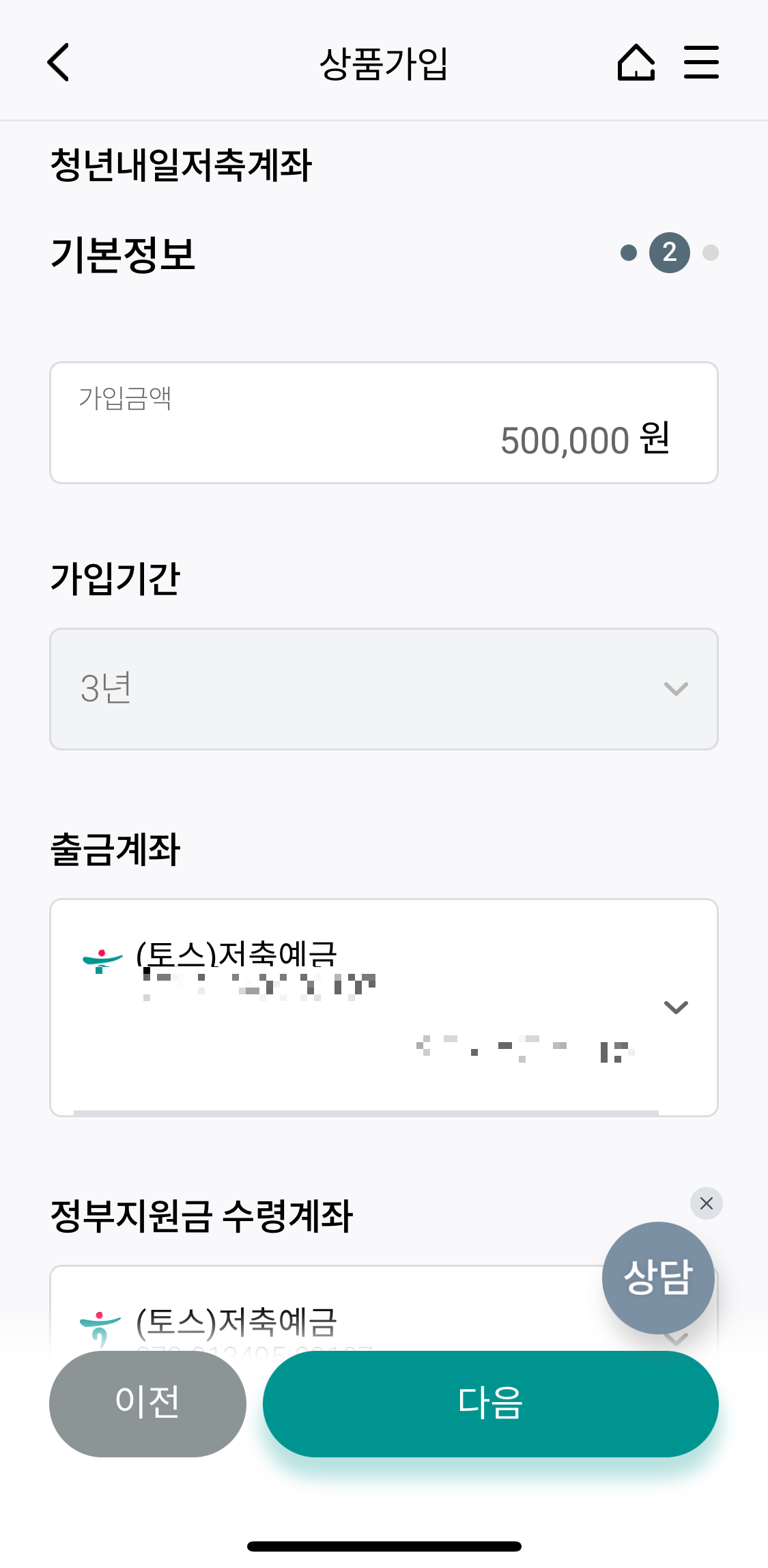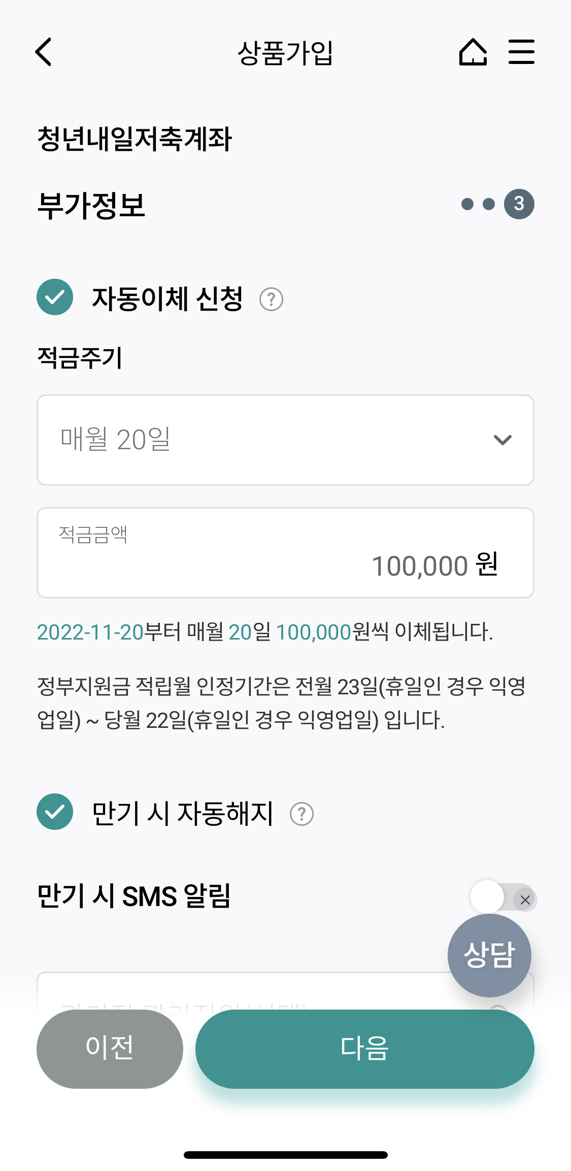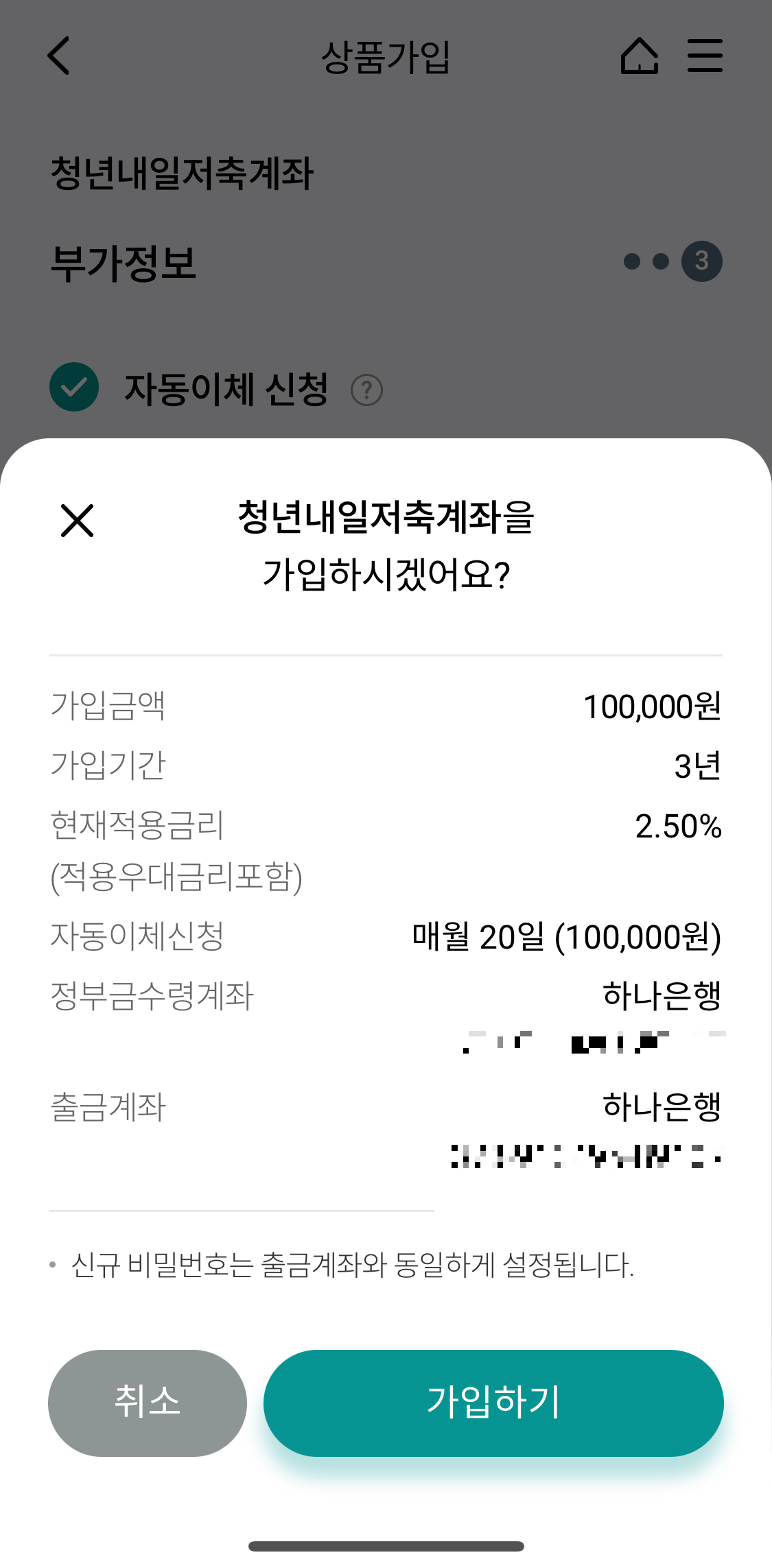 마지막으로 가입금액 / 기간 / 현재 적용금리 / 자동이체 일자 / 출금 계좌등이 나오고