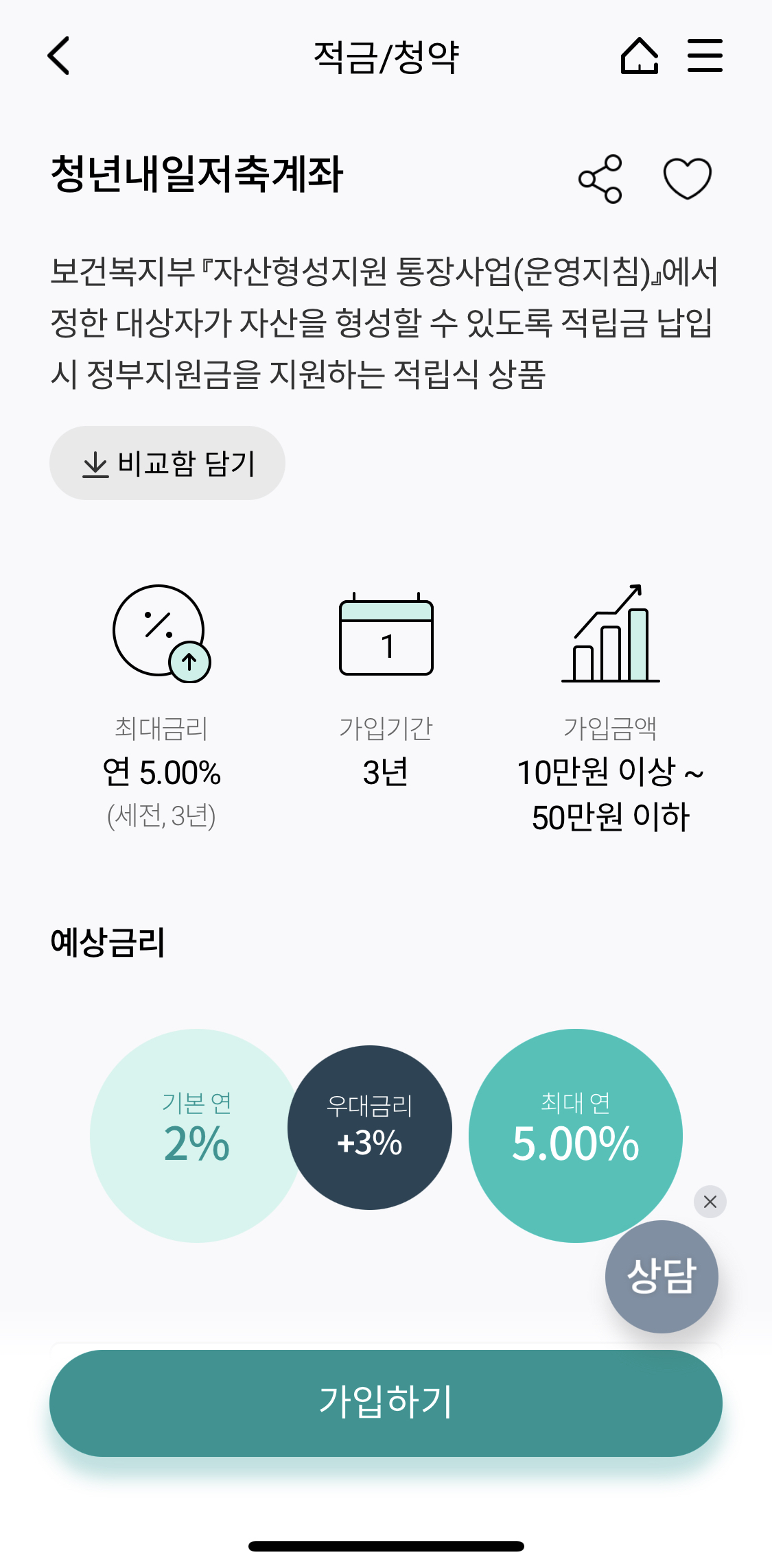 최대금리는 연 5%이고, 가입 기간은 3년입니다.