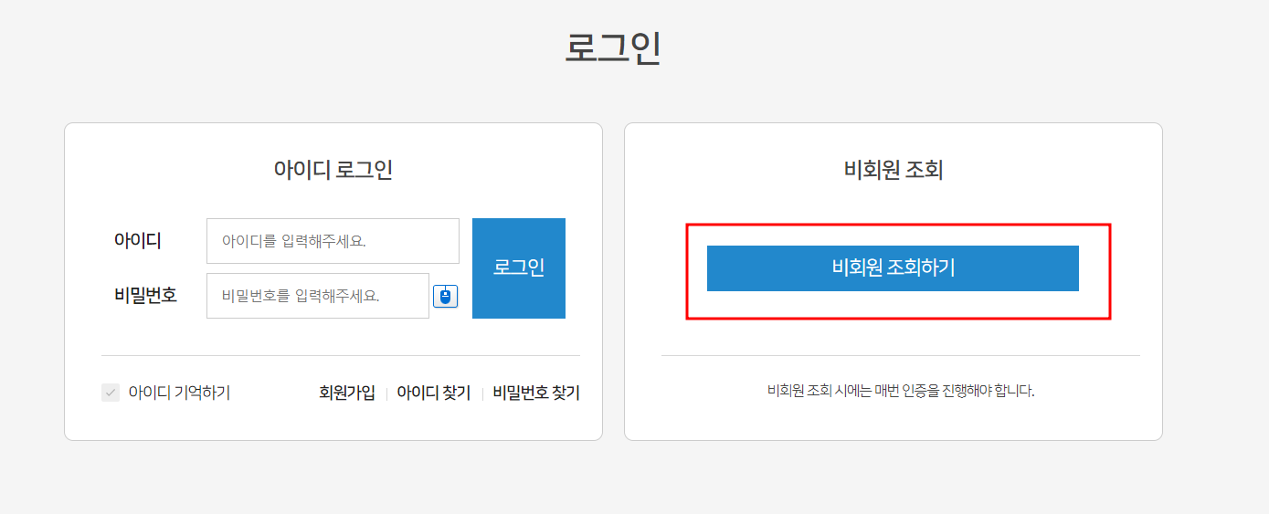 회원이 아닌 분들은 비회원 조회하기를 눌러주세요.