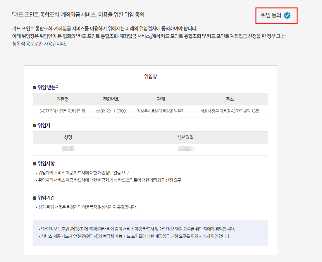 카드 포인트 통합조회 / 계좌입금 서비스를 이용하기 위해서는 위임 절차를 동의해야 합니다.