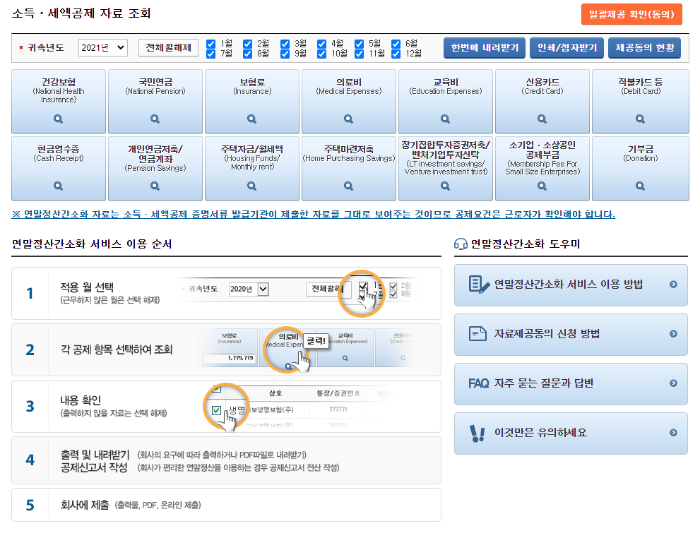 연말정산간소화 서비스 이용 순서에 따라 진행 하시면 됩니다.