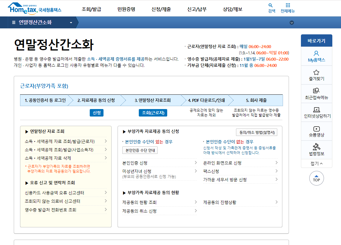 PC 홈택스 > 조회/ 발급 > 연말정산 간소 > 부양가족 자료제공 동의 신청