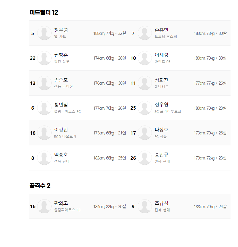 MF 정우영(알사드),손흥민(토트넘 훗스퍼),권창훈(김천상무),이재성(마인츠 05),