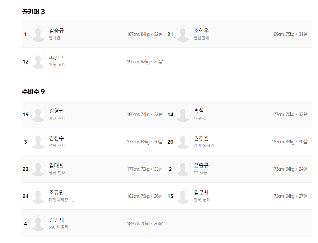 GK 김승규(얄샤밥),조현우(울산현대),송범근(전북현대)