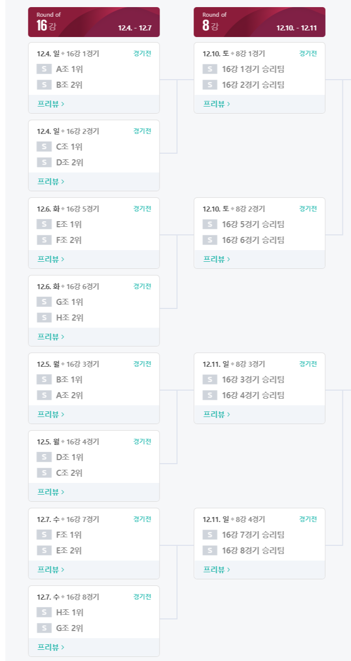 카타르 월드컵의 16강 경기는 12/4 ~ 12/7