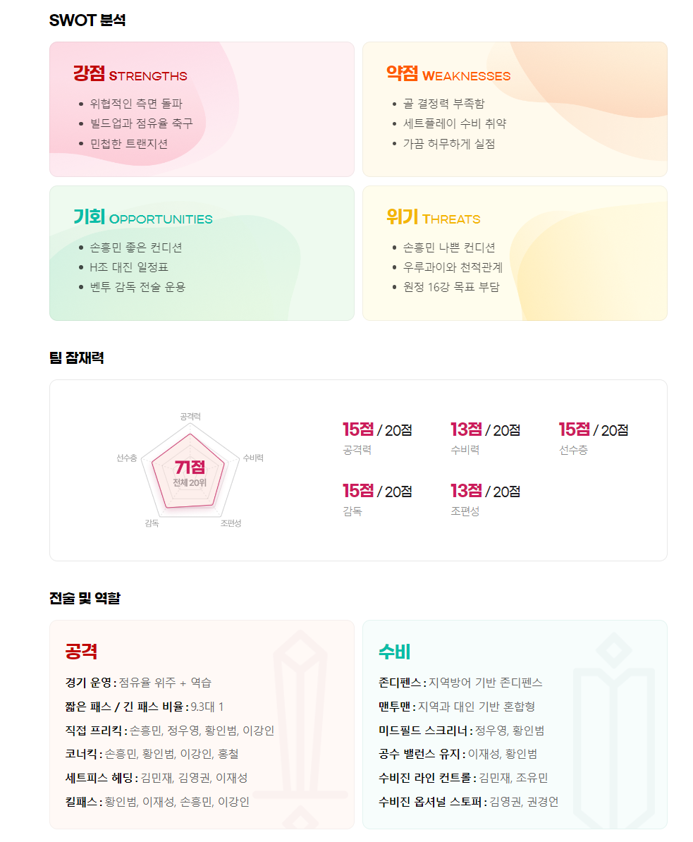 팀 잠재력, 전술 및 역할에 대한 정리표 입니다.