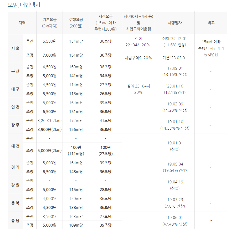 서울/ 광명의 택시비는 모두 인상되었습니다.