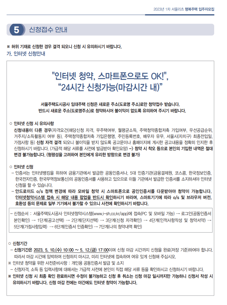 행복주택 청약 접수 : 5월 10일 10:00 ~12일 17:00 (수요일 ~ 금요일)